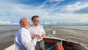 Reprodução Lula e Macron lado a lado Em um comunicado conjunto divulgado nesta terça-feira (26), o presidente Luiz Inácio Lula da Silva (PT) e o